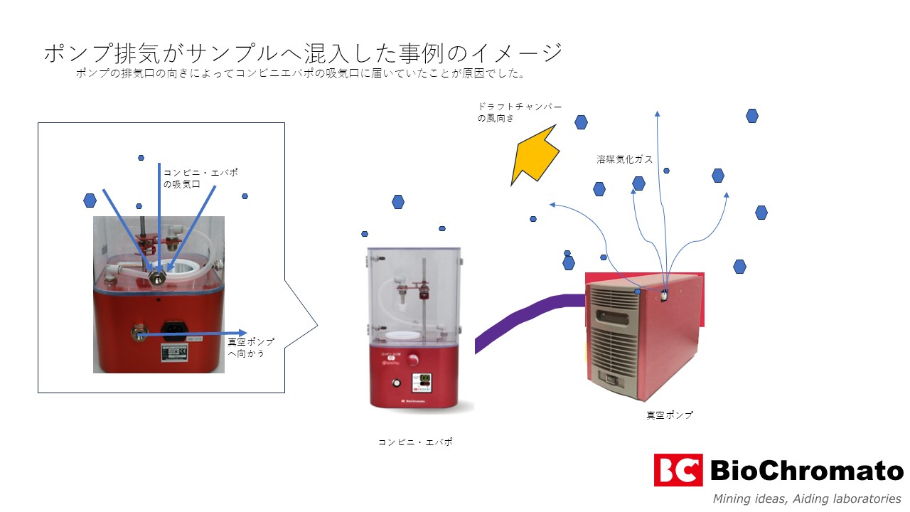 一度お預かりして作業をさせていただく必要がございます。一方で、流路としては濃縮サンプルよりもポンプ側(川下)に位置するためサンプル側に逆流して汚染されるというのは条件的に考えづらいとも言えます。一つの事例として、以前弊社のコンビニ・エバポユーザー様から『含まれるはずのないポリマー成分がサンプルに混入する』というお話をいただき検証したことがあったのですが、結果的には、真空ポンプの排気ガスがコンビニ・エバポに戻り、サンプルに混入していたことが分かりました。ドラフト内での設置ではありましたが、ポンプの排気ガスの向きがコンビニ・エバポ側にあったために、結果的には微量循環されてしまったということでした。